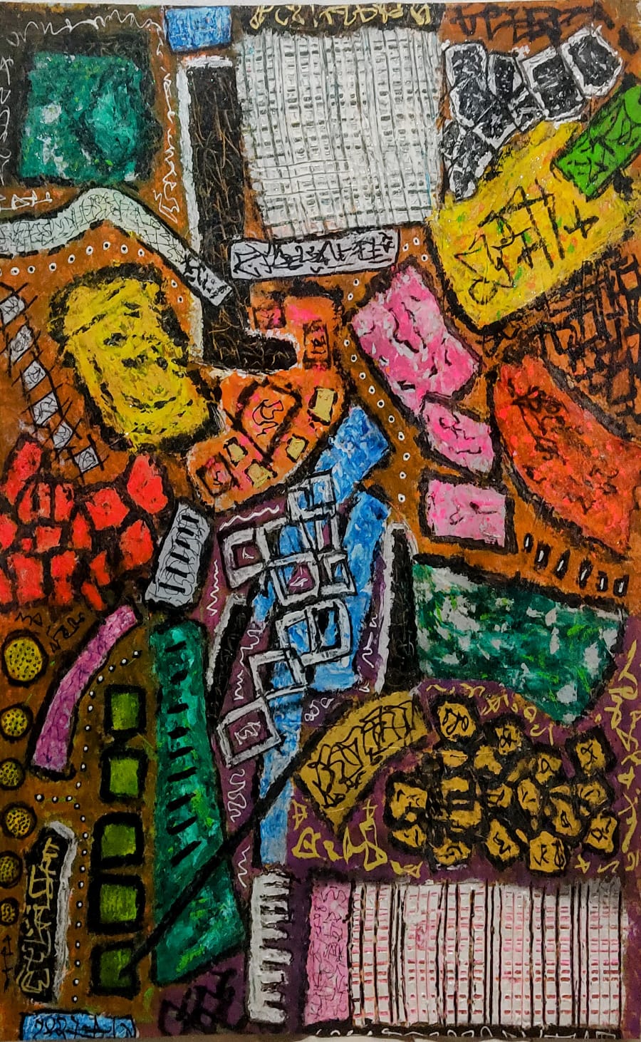O que salta aos olhos em sua pintura é a honestidade do fazer. Há algo de artesanal, quase musical, em suas composições, como se ele tocasse o espaço com pinceladas que lembram partituras visuais. A presença de grades, linhas, padrões geométricos interrompidos, colagens, inscrições, manchas e sobreposições dá à obra uma densidade rítmica que lembra a cidade. Como se Recife estivesse ali, não como paisagem figurativa, mas como energia plástica.